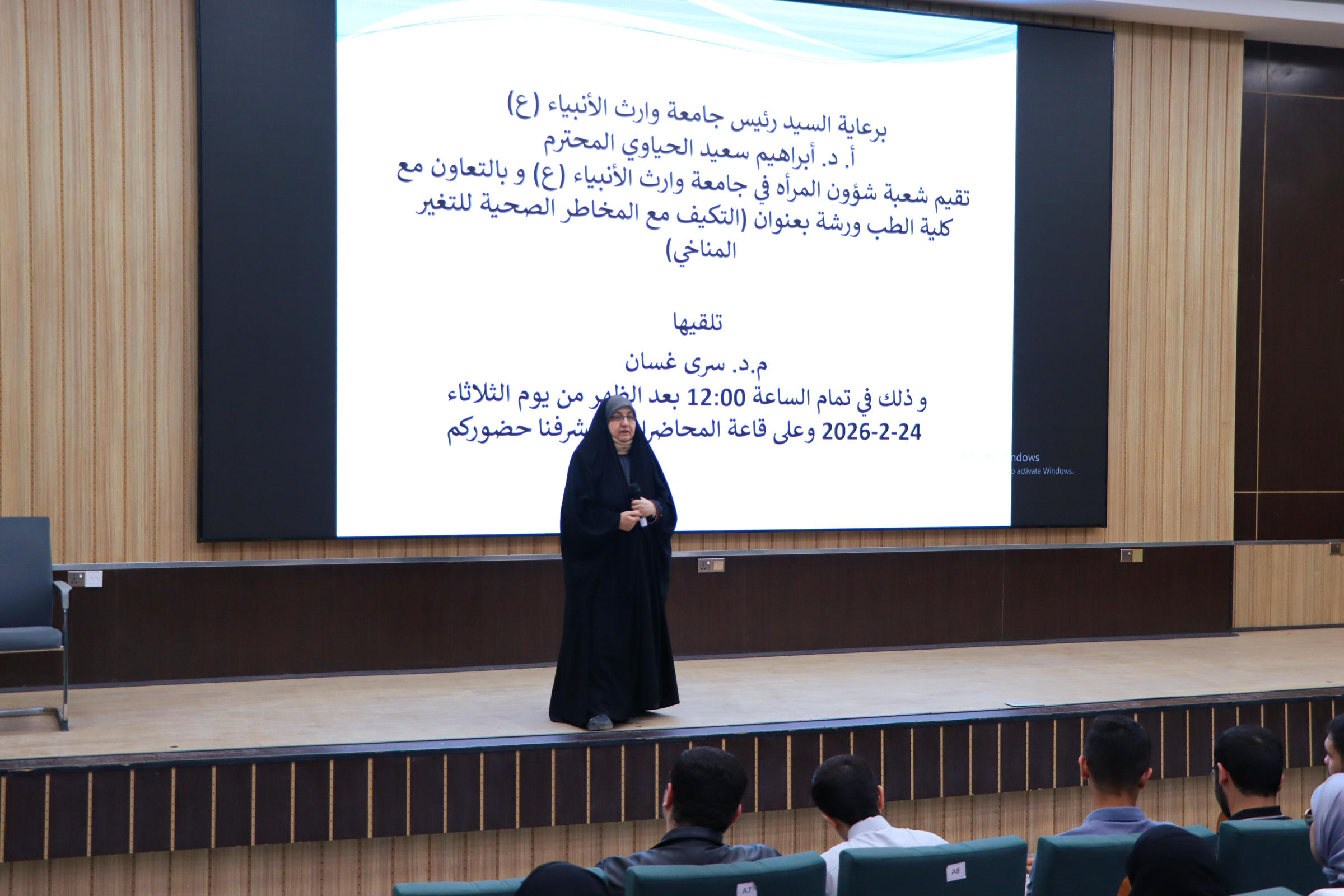 برعاية السيد رئيس جامعة وارث الأنبياء (ع) الأستاذ الدكتور إبراهيم سعيد الحياوي، أقامت شعبة شؤون المرأة وبالتعاون مع كلية الطب ورشة علمية بعنوان “التكيف مع المخاطر الصحية للتغير المناخي”، قدّمتها م.د. سرى غسان.