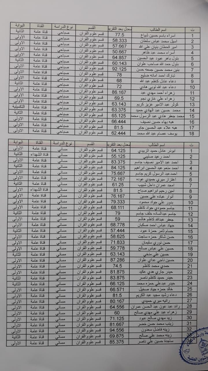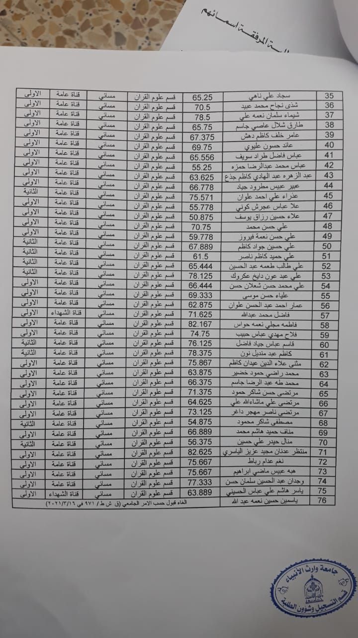 على الطلبة المدرجة أسماءهم ادناه جلب وثائقهم وتسليمها إلى قسم التسجيل علما أن آخر موعد لاستلامها هو بتاريخ ١٨ / ٤ / ٢٠٢١