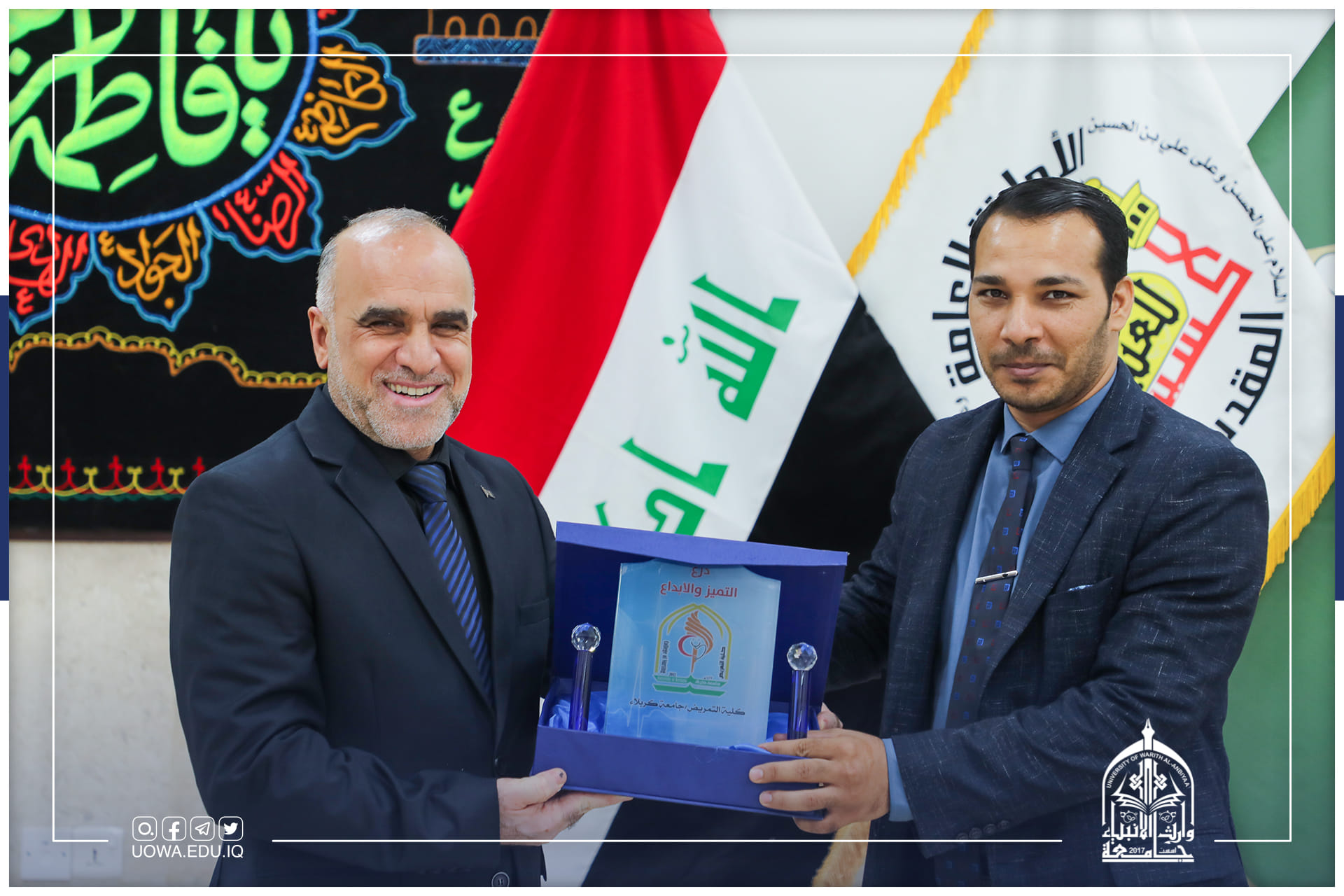 استقبل السيد المساعد العلمي الاستاذ الدكتور عباس الدعمي، وفد من كلية التمريض في جامعة كربلاء برئاسة عميد الكلية ورئيس لجنة عمداء كليات التمريض العراقية الاستاذ الدكتور علي كريم خضير الذي زار الجامعة لتقديم درع التميز والابداع للسيد رئيس الجامعة وتسلمه بالنيابة السيد المساعد العلمي والسيد عميد كلية التمريض والسيد عميد كلية الطب ذلك لمساهمتهم الفاعلة وتعاونهم في انجاح الإمتحانات النهائية التقويمية للطلبة للعام الحالي 2021 -2022 إضافة الى كتب شكر وتقدير.