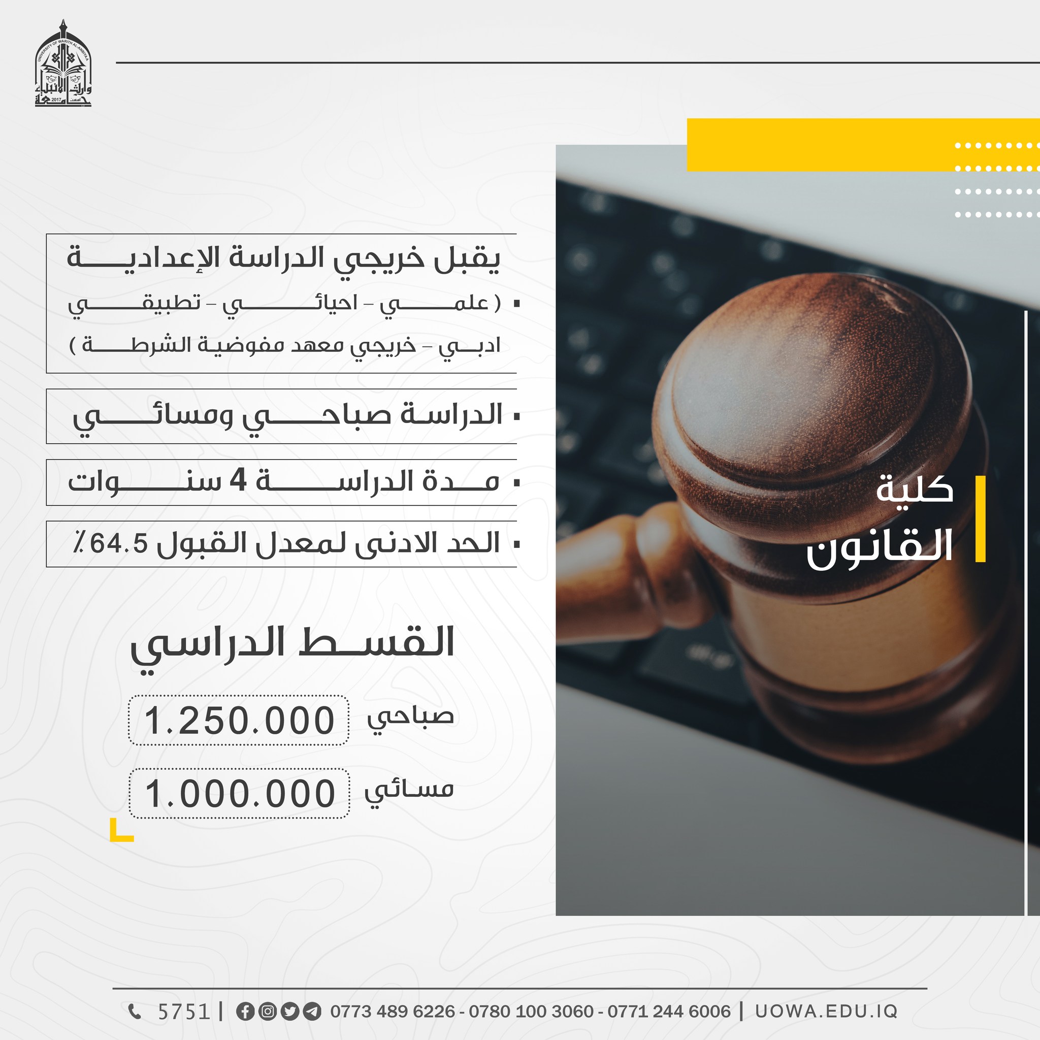 (عدا كلية الطب) اعزاءنا الطلبة الراغبين بالتسجيل في كليات واقسام جامعة وارث الانبياء(عليه السلام) (عدا كلية الطب) مراجعة الجامعة ابتداءً من السبت، إذ سيكون فريق التسجيل بانتظاركم من الساعة( ٨ ) صباحاً ولغاية( ٥ ) مساءً