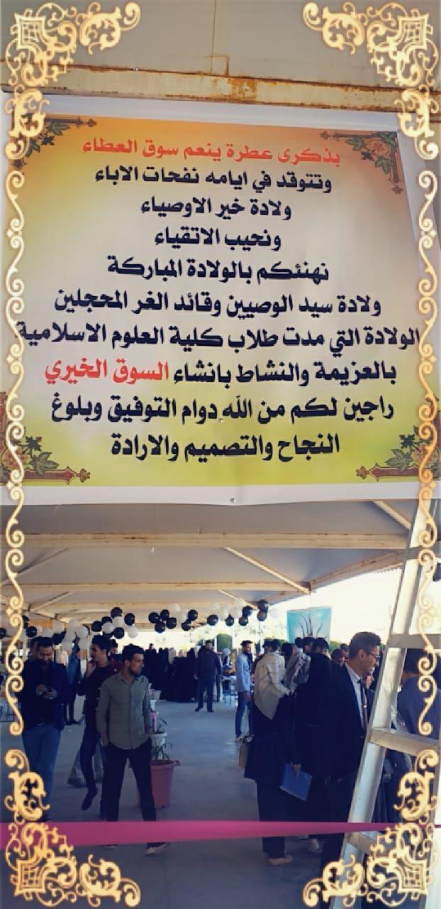اقيم على حدائق جامعة وارث الانبياء برعاية كلية العلوم الاسلامية وباقي كليات الجامعة سوق خيري تزامناً مع ولادة الامام علي (ع) يذهب ريعه لعوائل الحشد الشعبي والمتعففين والايتام في مدينة كربلاء .