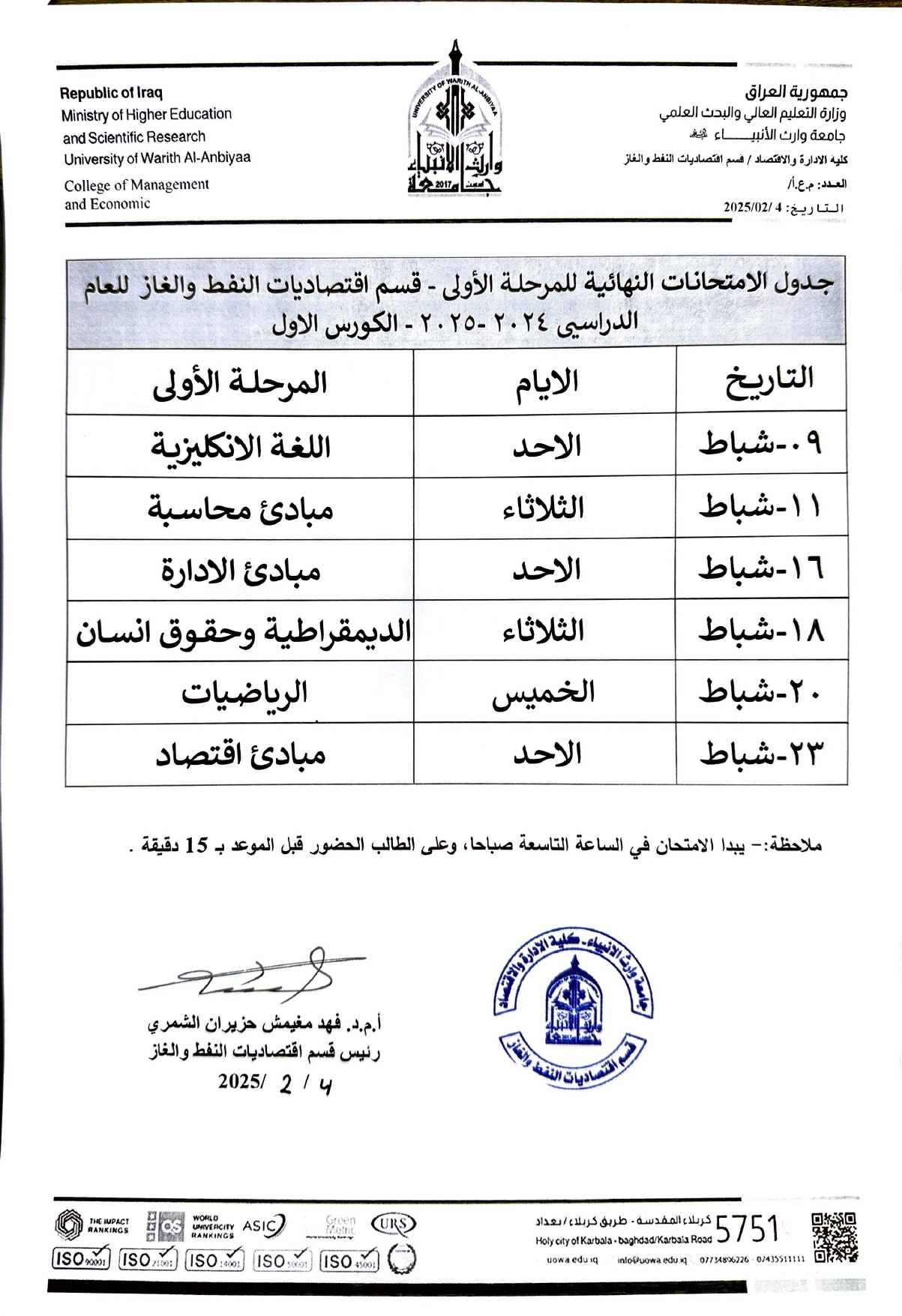 بتاريخ 8\11\2025 ابتداءً من يوم السبت في بناية العلى قاعة 202