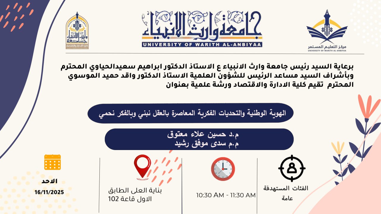 في كلية الإدارة والاقتصاد – قسم إدارة الأعمال جامعة وارث الأنبياء حيث نُخرّج قادة المستقبل القادرين على رسم ملامح الاقتصاد وإدارة المؤسسات بكفاءة وابتكار.