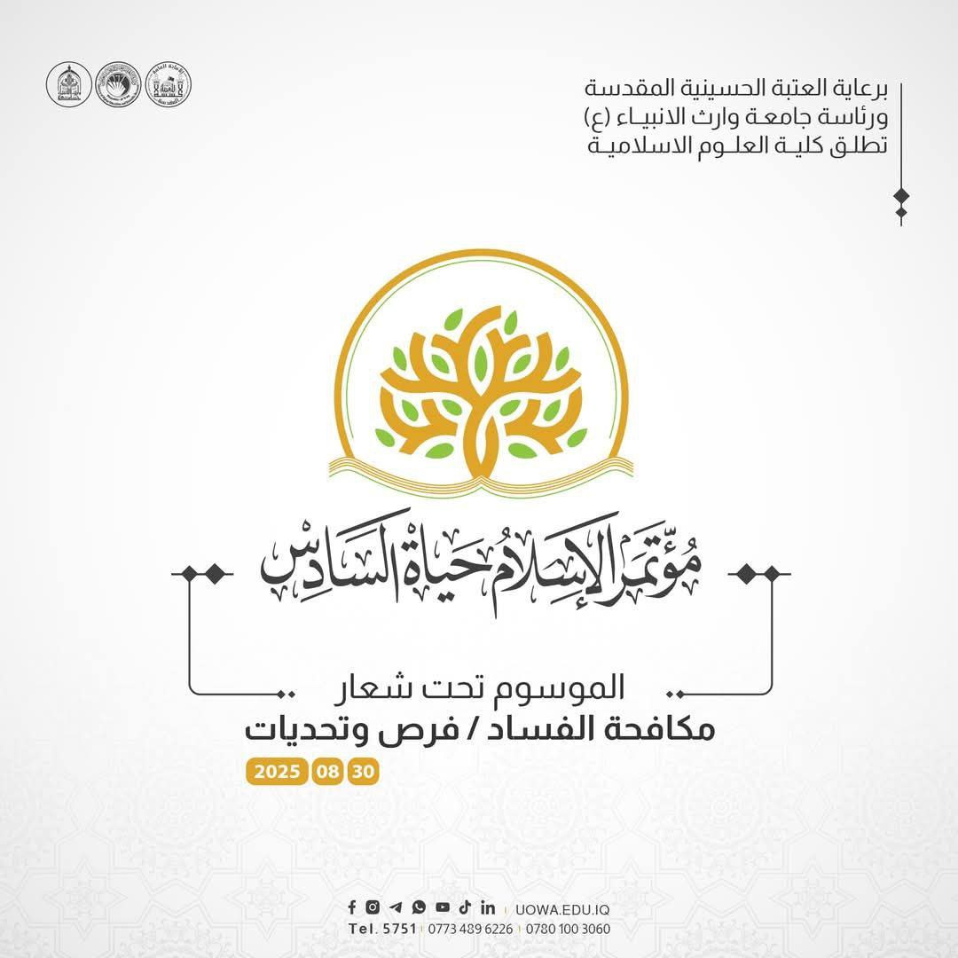 برعاية العتبة الحسينية المقدسة ورئاسة جامعة وارث الانبياء (ع) تطلق كلية العلوم الاسلامية "مؤتمر الاسلام حياة السادس" الموسوم بـ مكافحة الفساد فرص و تحديات