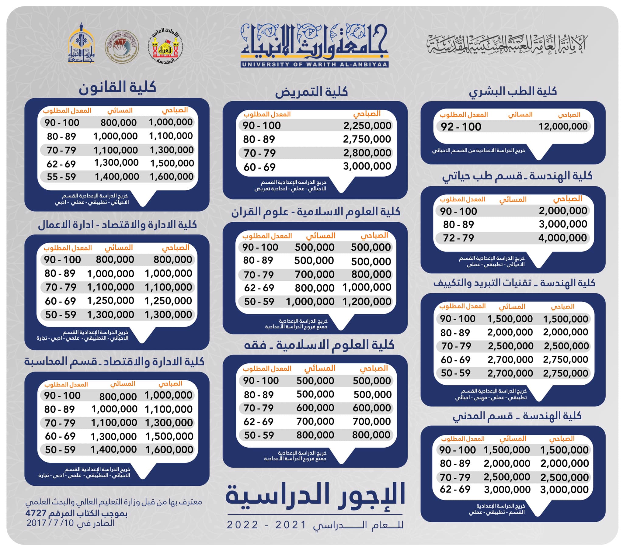 أطلقت جامعة وراث الأنبياء (عليه السلام) سلم الأجور الدراسية ومعدلات القبول لكلا الدراستين الصباحية والمسائية للعام الحالي 2021-2022 بحسب ضوابط وزارة التعليم العالي والبحث العلمي.