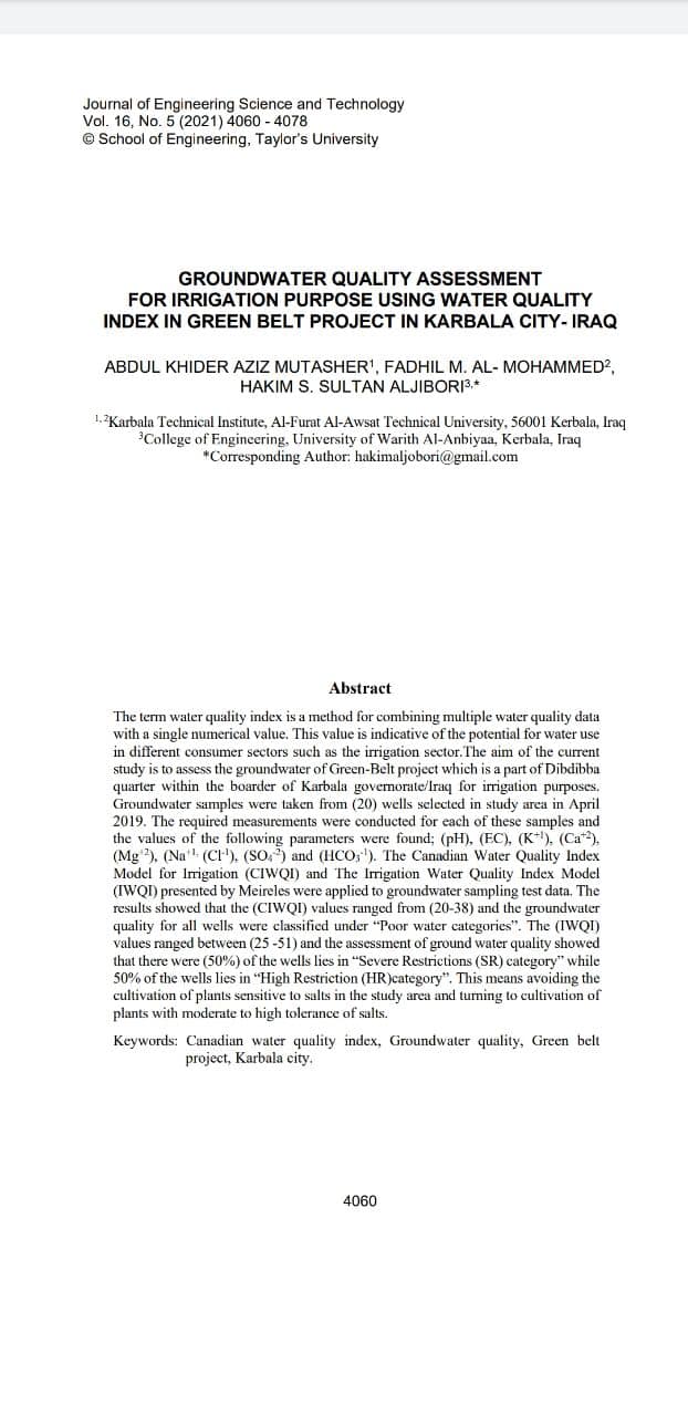 بحث علمي جديد لعميد كلية الهندسة في جامعة وارث الانبياء(عليه السلام) نشر الباحث والأكاديمي ا.م.د حاكم الجبوري عميد كلية الهندسة بمشاركة عدد من الباحثين هم م. عبد الخضر عزيز مطشر والباحث ا. د. فاضل محمد من جامعة الفرات الأوسط بحثاً تطبيقيا مشتركا في مجلة العلوم الهندسية والتكنلوجيا العالمية وهي ضمن قاعدة بيانات سكوباس وكلاريفيت ( Q2). وقال الدكتور حاكم الجبوري : هذا البحث يعتبر من البحوث التطبيقية في محافظة كربلاء والذي هو عبارة عن تقييم عملي للمياه الجوفية في الحزام الأخضر لمنطقة دبدبة ضمن المحافظة اذ يمكن استخدام هذه الدراسة كمرجع للباحثين وقاعدة بيانات مهمة للوزارات والدوائر المعنية رابط البحث:https://jestec.taylors.edu.my/V16Issue5.htm