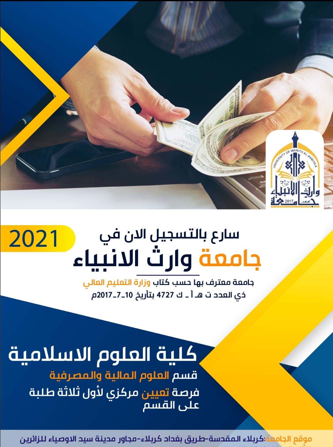 جامعة وارث الانبياء(عليه السلام) تستحصل موافقة وزارة التعليم العالي والبحث العلمي لاستحداث قسم العلوم المالية والمصرفية الإسلامية في كلية العلوم الإسلامية للدراسة الصباحية فقطيقبل القسم خريجي احيائي + تطبيقي + علمي + ادبي + وخريجي مراكز التدريب المهني الذي تكون مدة الدراسة فيها ثلاث سنوات الطلبة الذين ادوا الامتحان الوزاري في الاختصاص المناظر+الاعداديات الاسلامية التابعة للتربية(صباحي ومسائي) +الاعداديات الاسلامية التابعة للوقفين (الدراسة الصباحية طلبة الدراسة الخارجية (من ادو الامتحان التقويمي فقط))+ معهد اعداد معلمين (قسم الدراسة الاسلامية ، قسم اللغة العربية)