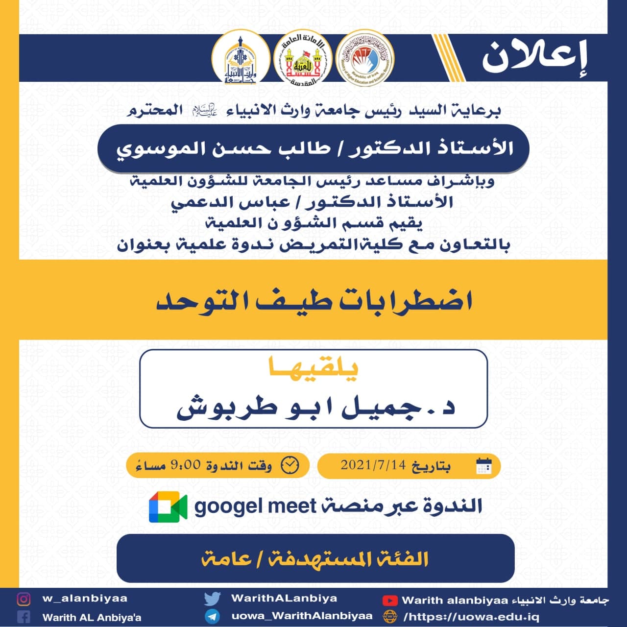 زيارة الفريق الوزاري لمتابعة الامتحانات النهائية الى جامعة وارث الانبياء (عليه السلام) زار الفريق الوزاري المختص بمتابعة الامتحانات النهاية الالكترونية والحضورية جامعة وارث الانبياء (عليه السلام) يوم الاثنين الموافق 2021/7/12 وذلك للاطلاع على سير الامتحانات النهائية في الجامعة خلال الزيارة الكترونيا تم اللقاء مع السيد رئيس الجامعة الدكتور عباس الدعمي و مسؤول التعليم الالكتروني الدكتور حيدر الغانمي وحضر في الاجتماع عدد من التدريسيين من الكليات والاقسام التي تؤدي الامتحان في ذلك الوقت. تم خلال الزيارة تعريف الفريق الوزاري بالاجراءات والتدابير الوقائية التي اتخذتها الجامعة للوقاية من انتقال الاصابات كما تجولت الوزارة الكترونيا في القاعات الامتحانية العملية و التحدث مع عدد من الطلبةفي الختام تقدم الفريق الوزاري لجامعة وارث الأنبياء (عليه السلام) وللكوادر بالشكر والثناء واشادوا بمستوى الجهوزية العالي الذي اعدته الجامعة في الاستعداد للامتحانات النهائية وكذلك اشادوا بالشكر على تواجد الكليات بشكل متواصل في منصات المتابعة الوزارية.