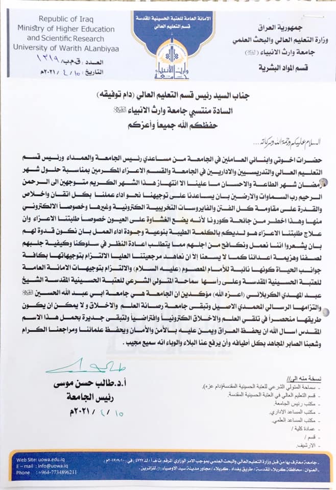 وبمتابعة مباشرة من قبل السيد رئيس الجامعة الاستاذ الدكتور طالب حسن موسى والسيد المساعد الإداري الأستاذ الدكتور نوفل الاعرجي