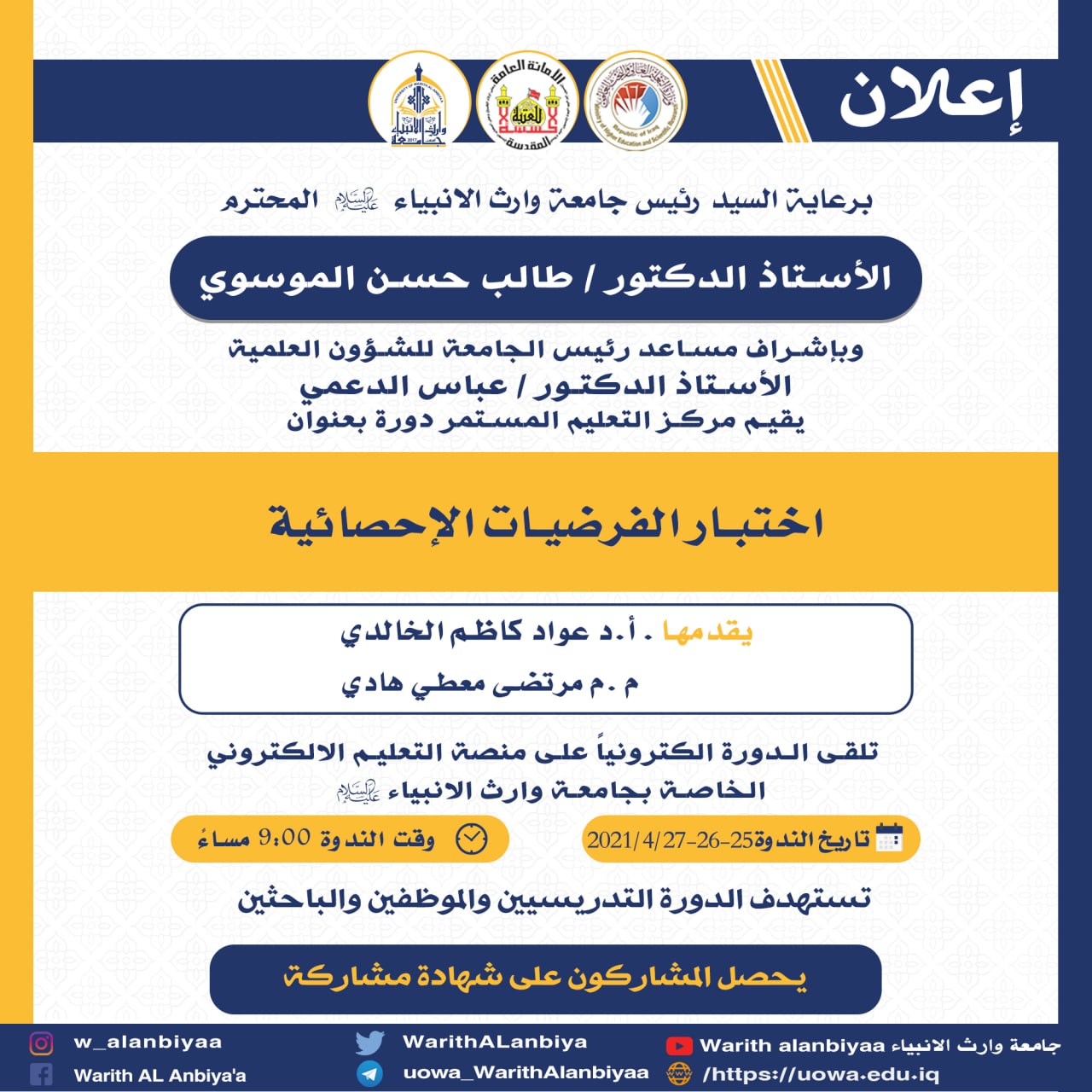 يقيم مركز التعليم المستمر في جامعة وارث الانبياء(عليه السلام) دورة علمية إلكترونية عبر منصه التعليم الالكتروني الخاصه بالجامعة ومن خلال الرابط التالي: