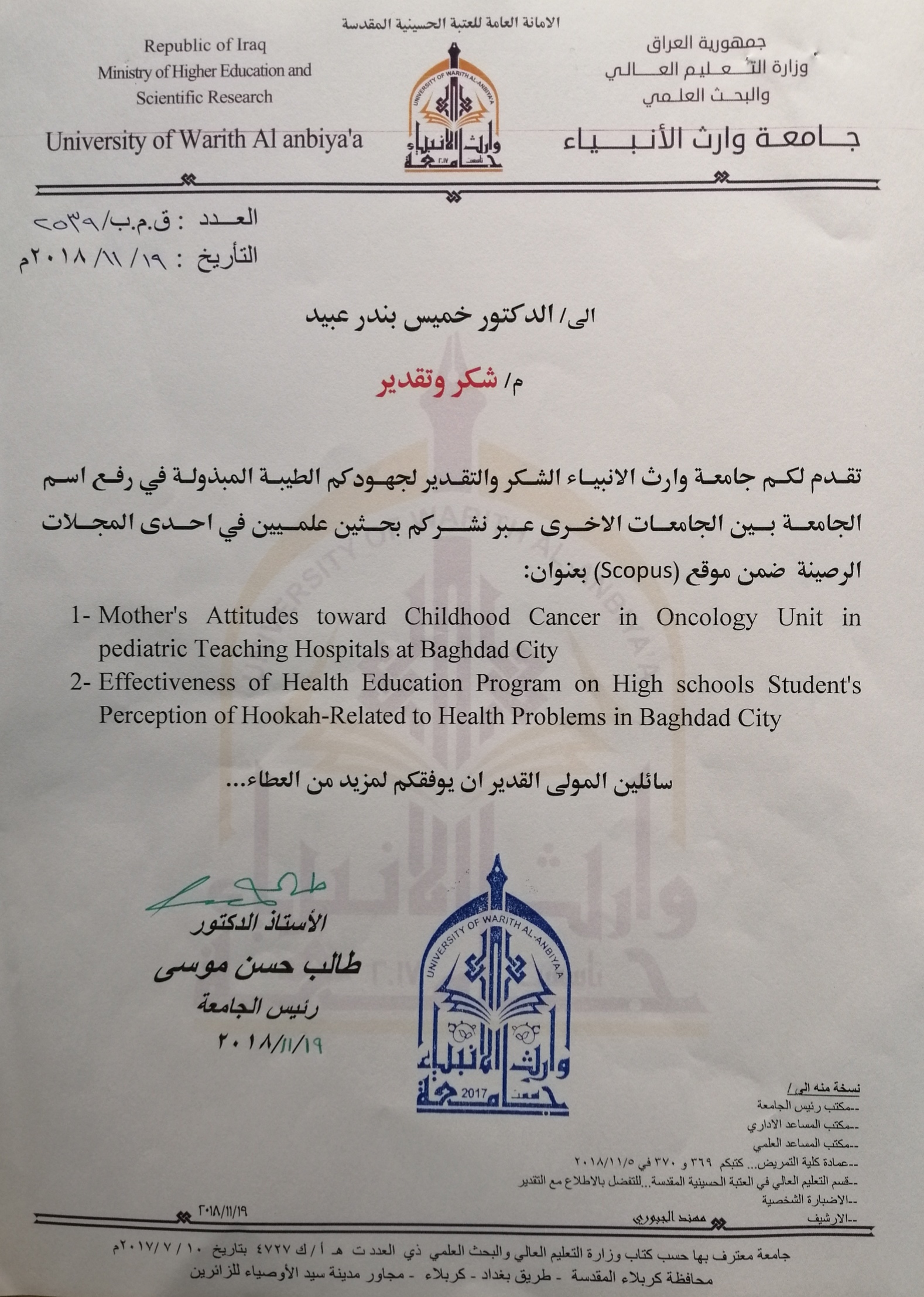وجه الاستاذ الدكتور طالب حسن موسى /رئيس جامعة وارث الانبياء كتاب شكر وتقدير الى الأستاذ المساعد الدكتور خميس بندر عبيد السعيدي /عميد كلية التمريض/جامعة وارث الانبياء وذلك لنشرة بحثين علميين في مجلة عالمية ويعد هذا العمل حلقة انجاز تضاف الى انجازات الكلية والجامعة على الصعيد العالمي في نشر البحوث.