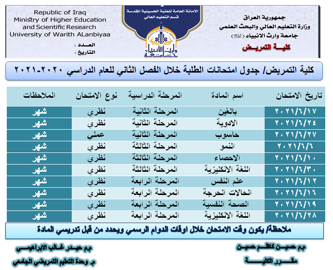 بعد مصادقة رئاسة جامعة وارث الانبياء (عليه السلام) على نتائج الطلبة للامتحانات النهائية للفصل الاول للعام الدراسي 2020-2021 .. تعلن عمادة كلية التمريض عن توزيع النتائج ولكافة المراحل الدراسية في مقر الكلية مع تمنياتها للطلبة بدوام التوفيق.