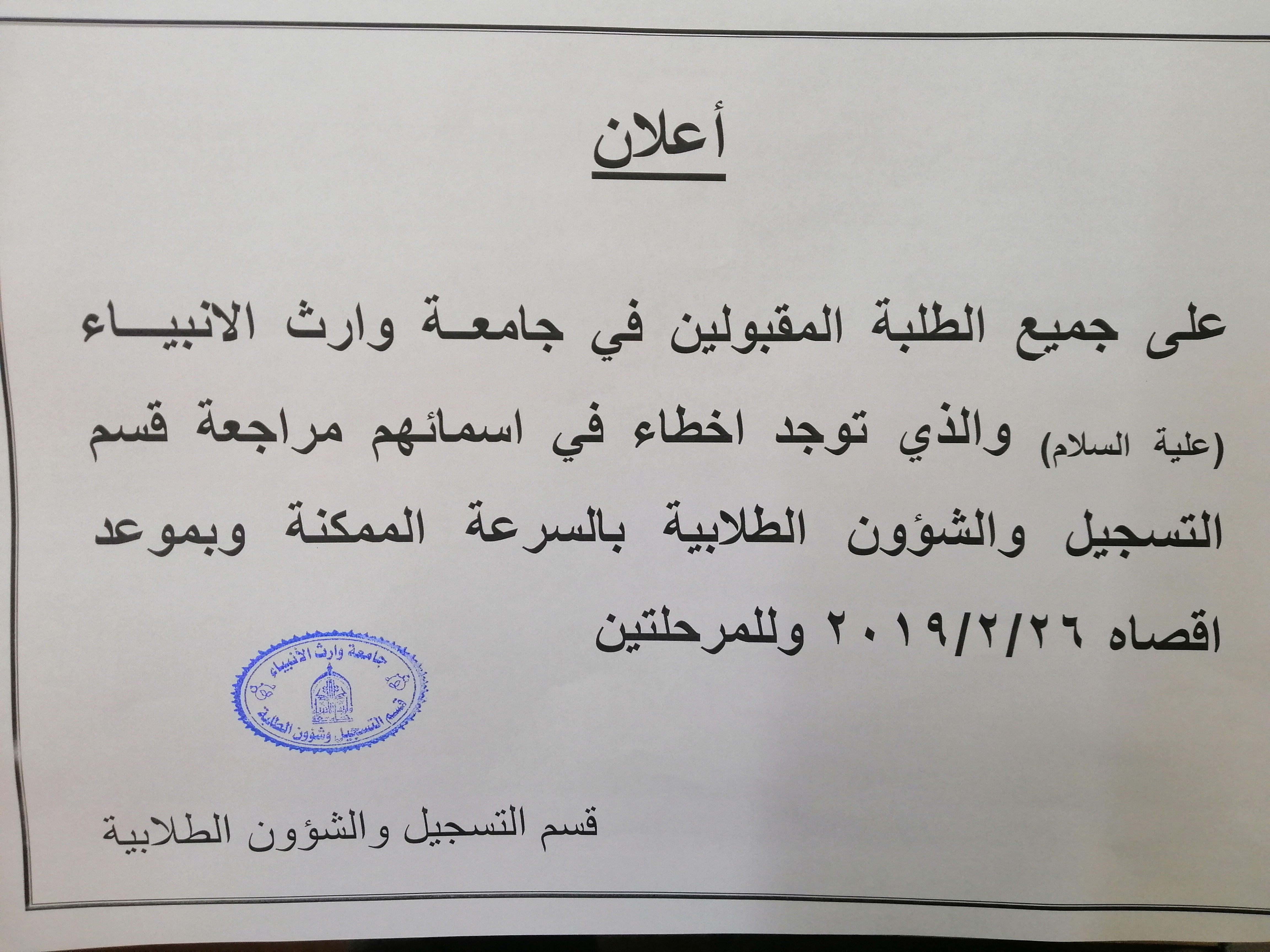 على الطلبة الوافدين الى جامعة وارث الانبياء للعام الدراسي ٢٠١٩/٢٠١٨ مراجعة قسم التسجيل بالسرعه الممكنه بموعد اقصاه ٢٠١٩/٢/٢٤ وحسب الكتاب المبين اعلاه.