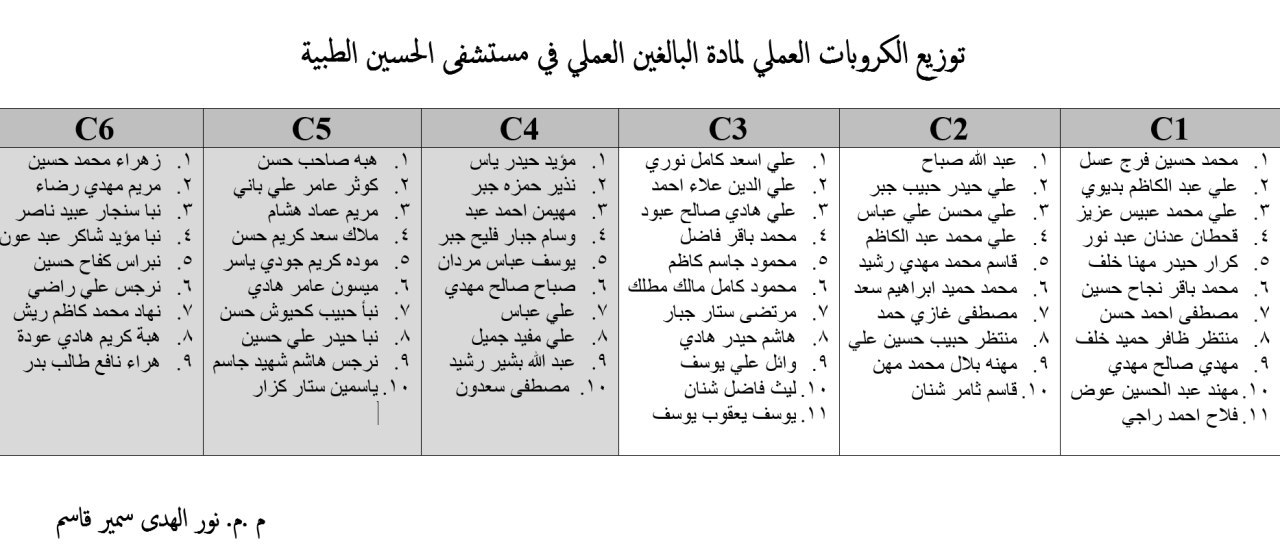 جداول توزيع طلبة المرحلة الثانية على الكروبات لمادة تمريض البالغين العملي في مستشفى الامام الحسين(ع) التعليمي / العام الدراسي ٢٠١٩-٢٠٢٠،