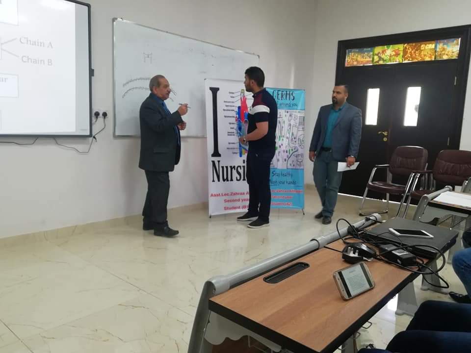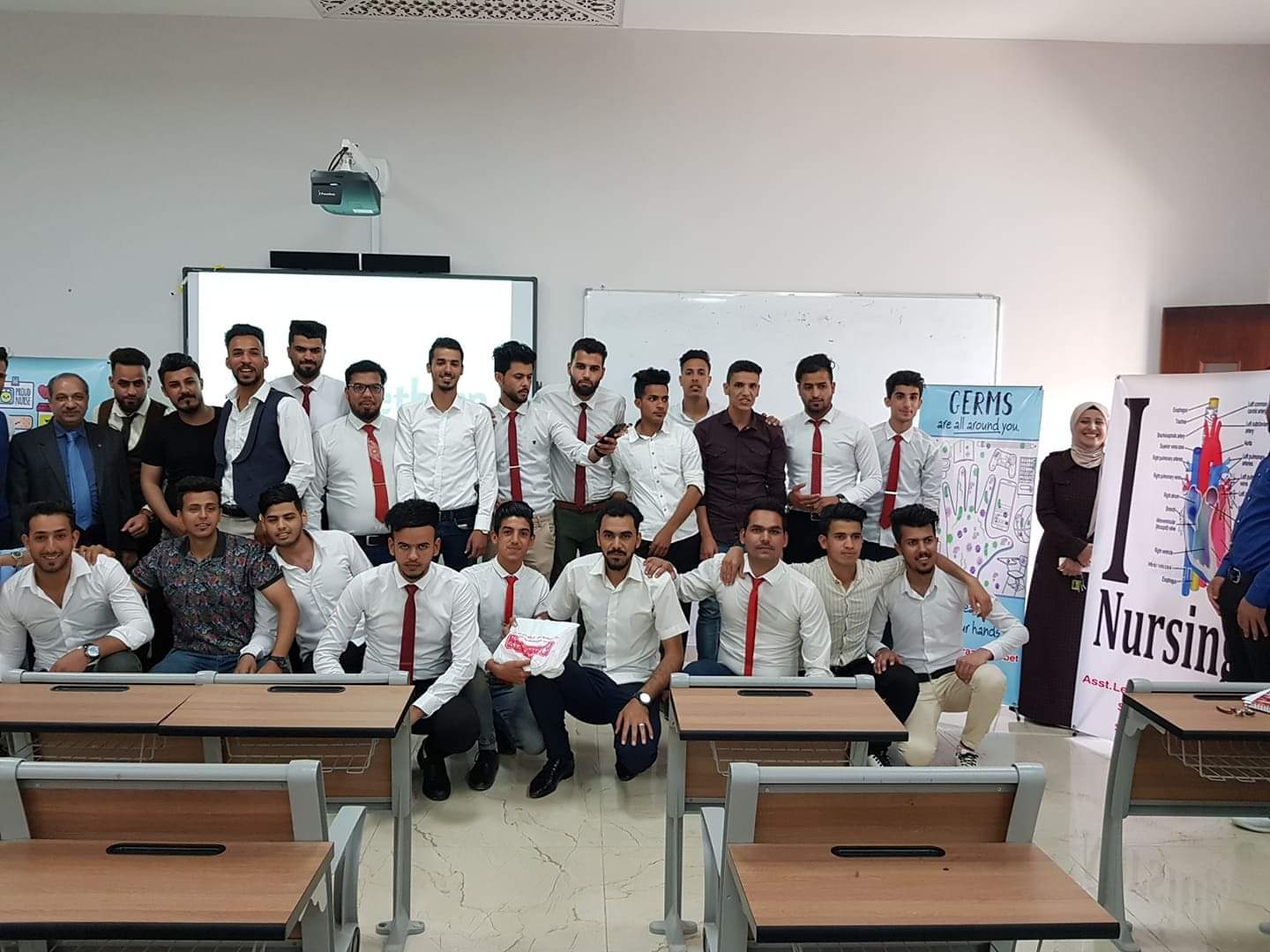أقامت كلية التمريض بحضور عدد من اساتذتها مسابقة علمية لطلبتها وكان الهدف من المسابقة تطوير الطلبة في مجال الالقاء واتقان اللغة الانكليزية والتركيز على الجانب العلمي للطلبة في مجال تخصصهم ، وابدى الاساتذة اعجابهم بمستوى الطلبة المتفوق وعلميتهم والاداء الذي ابهرهم ، بالمقابل عبر الطلبة عن شكرهم وامتنانهم لهذه المبادرة العلمية التي كانت جزء مهم في تطوير امكاناتهم وعلميتهم،