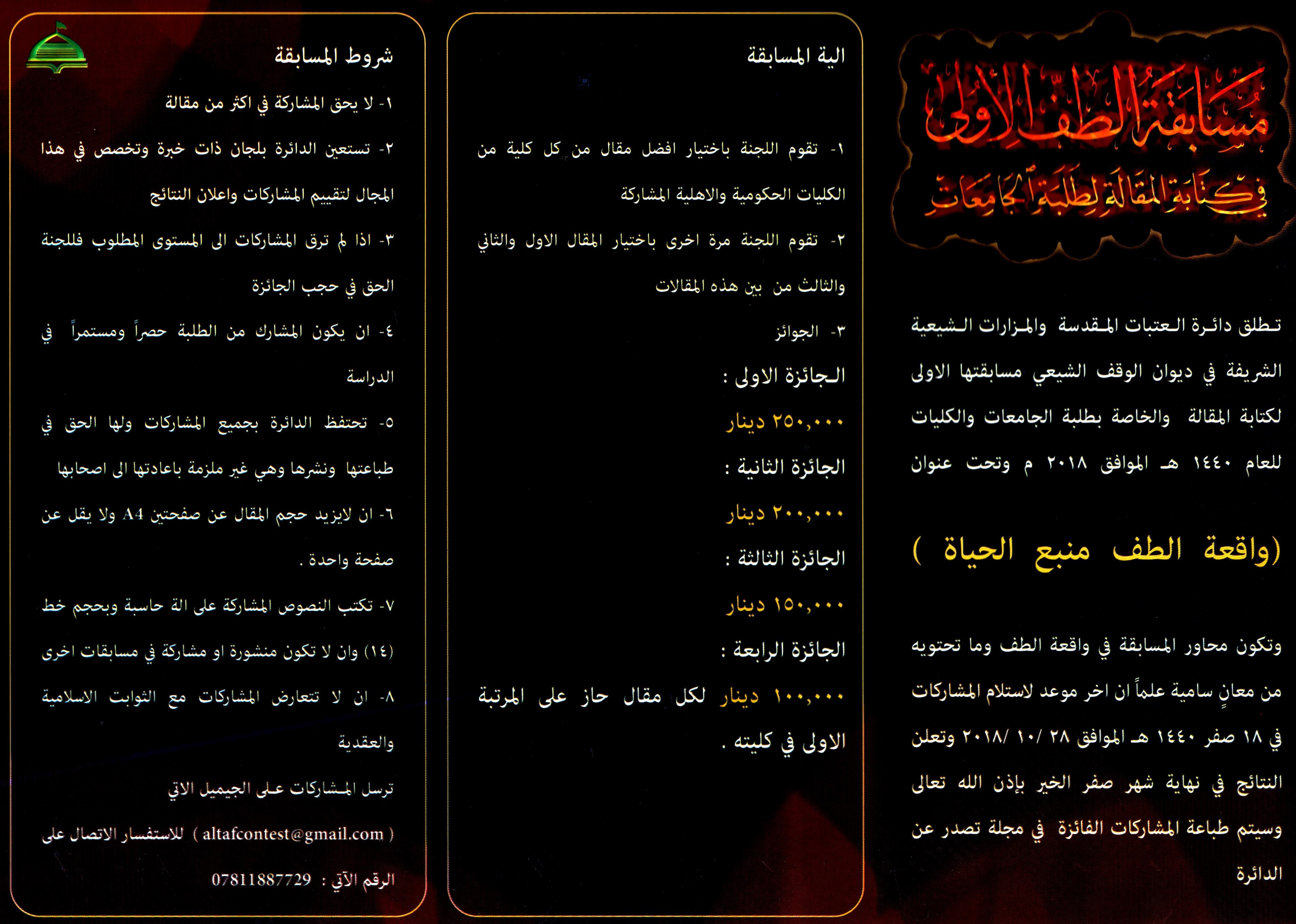 تُعلن دائرة العتبات المقدسة والمزارات الشيعية الشريفة في ديوان الوقف الشيعي عن اطلاق مسابقتها الاولى لكتابة المقال والخاصة بطلبة الجامعات والكليات تحت عنوان (واقعة الطف منبع الحياة) ,وتكون محاور المسابقة في واقعة الطف وماتحتويه من معان سامية علماً أن أخر موعد لاستلام المشاركات في 18 صفر الموافق 28/10/2018 وتعلن النتائج في نهاية شهر صفر الخير بأذن الله تعالى وسيتم طباعة المشاركات الفائزة في مجلة تصدر عن الدائرة.