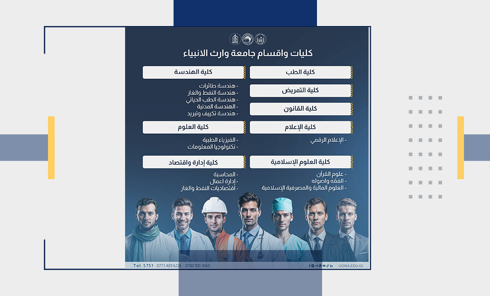 تُعلن جامعة وارث الأنبياء (ع) عن فتح باب التقديم ضمن برنامج “ادرس في العراق”، وذلك للراغبين بالالتحاق بكليات وأقسام الجامعة في إطار المبادرة الوطنية التي أطلقتها وزارة التعليم العالي والبحث العلمي العراقية.