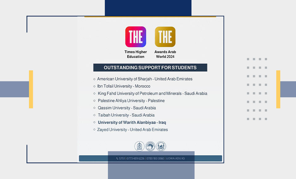 تعزيزاً لمكانتها كمركز تعليمي متميز على المستوى الإقليمي والعالمي، رشُحت جامعة وارث الأنبياء (عليه السلام) ضمن عدد من الجامعات العربية لجائزة التايمز للعالم العربي 2024