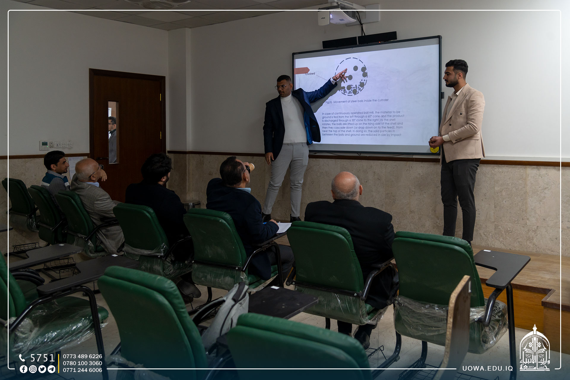 بحضور مساعد رئيس الجامعة للشؤون العلمية الاستاذ الدكتور عباس الدعمي وعميد كلية الهندسة الاستاذ الدكتور واقد الموسوي، والاستاذ محمد الكناني رئيس قسم تطويرالموارد البشرية / مركز رعاية الشباب بالعتبة الحسينية المقدسة.