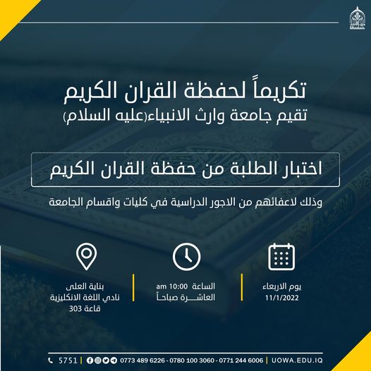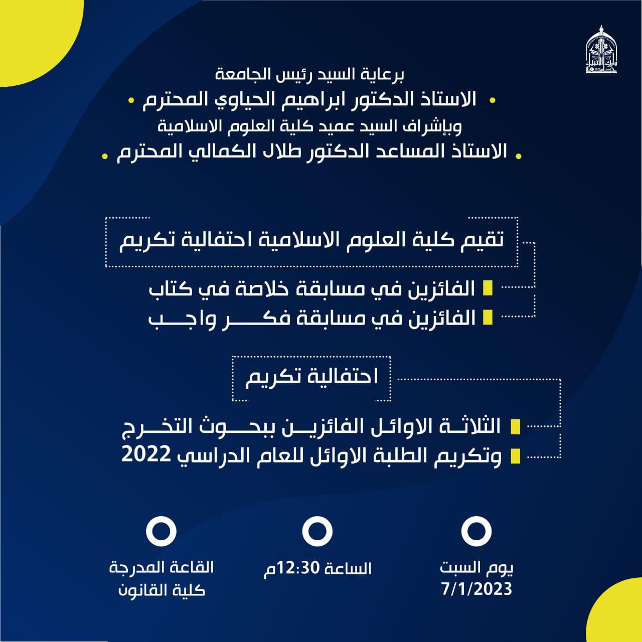 برعاية كريمة من الاستاذ المساعد الدكتور طلال فائق الكمالي تنظم عمادة كلية العلوم الاسلامية مناسبات عدة في يوم السبت الموافق ٧/١/٢٠٢٣ وهي الاتي:المناسبة الاولى: حفل استقبال وتعارف طلبة المرحلة الاولى للدراستين الصباحي والمسائي.المناسبة الثانية : حفل تكريم الطلبة الاوائل للعام الدراسي ٢٠٢١-٢٠٢٢.المناسبة الثالثة : حفل تكريم الخريجين للعام الدراسي ٢٠٢١-٢٠٢٢.المناسبة الرابعة : حفل تكريم بحوث التخرج الثلاث الاوائل للعام الدراسي ٢٠٢١-٢٠٢٢.المناسبة الخامسة : حفل تكريم تكريم الطلبة الفائزين بالمناسبات الفكرية والثقافية التي إقامتها لجنة النشاطات الطلابية وهي: (مسابقة فكر وأجب ، مسابقة خلاصة كتاب) علما ان المسابقة الاولى عامة والعشرة الاوائل على الجامعة ككل أما الثانية فهي خاصة بطلبة كلية العلوم الاسلامية .