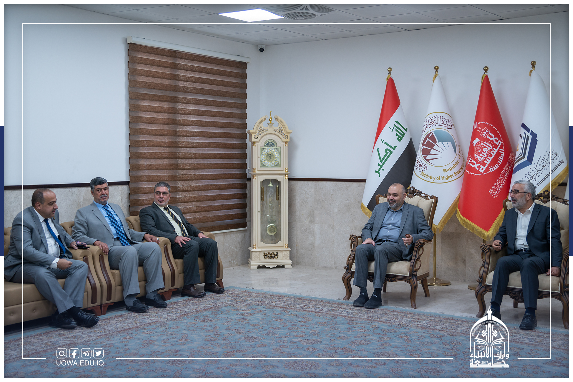 زار جناب الأمين العام للعتبة العلوية المقدسة السيد عيسى الخرسان يرافقه السيد نائب الامين العام للعتبة الحسينية المقدسة الدكتور علاء ضياء الدين، والوفد المرافق لهما جامعة وارث الانبياء(عليه السلام)، وكان باستقبالهما السيد رئيس الجامعة الاستاذ الدكتور ابراهيم الحياوي والسادة مساعدي رئيس الجامعة وعدد من عمداء الكليات، إذ اطلع جناب الأمين العام على صرح الجامعة وأعرب عن اعجابة الشديد بما تمتلكه من امكانيات مادية وبشرية