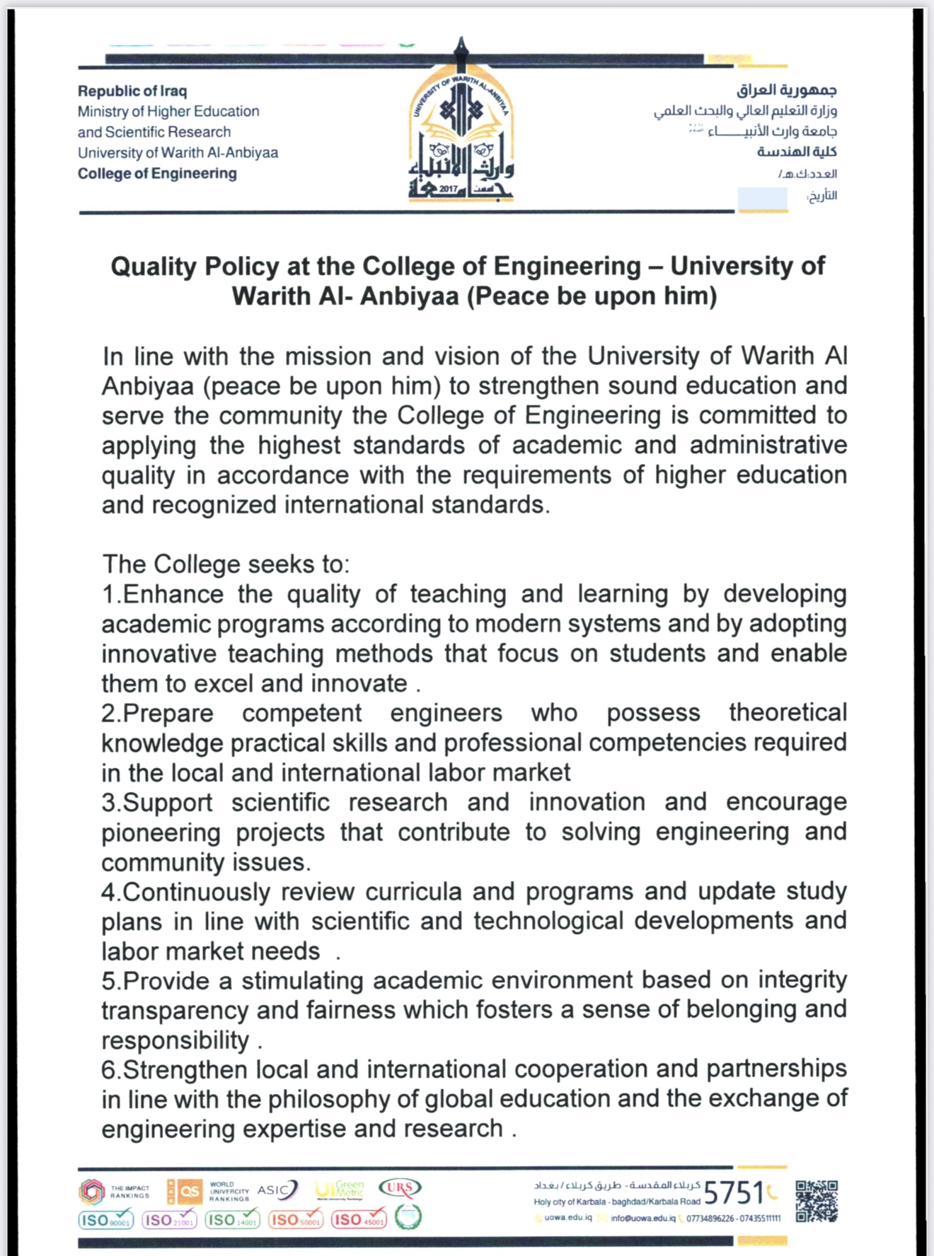 Quality Policy at the College of Engineering – University of Warith Al Anbiyaa (Peace be upon him)