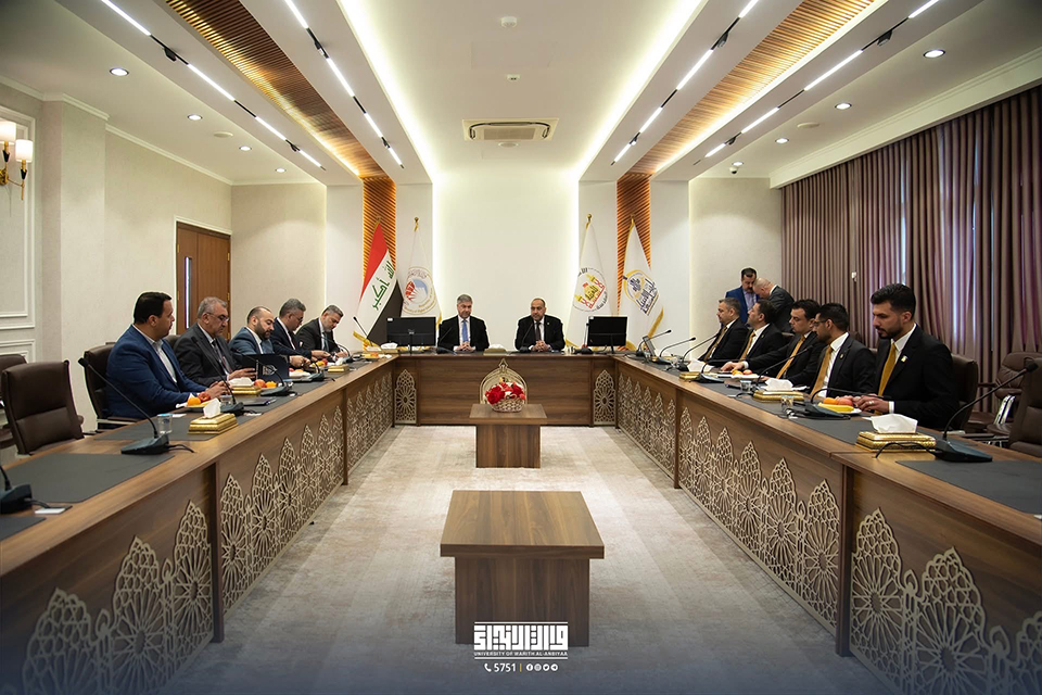 As part of its efforts to strengthen institutional cooperation with state institutions, the Presidency of the University of Warith Al-Anbiyaa received a high-level delegation from the Iraqi Ministry of Foreign Affairs, headed by the Deputy Minister for Political Planning, Dr. Hisham Al-Alawi. The delegation was welcomed by the University President, Professor Dr. Ibrahim Saeed Al-Hayyawi, accompanied by the Vice President for Scientific Affairs, Professor Dr. Waqed Al-Moussawi, and members of the University Council.