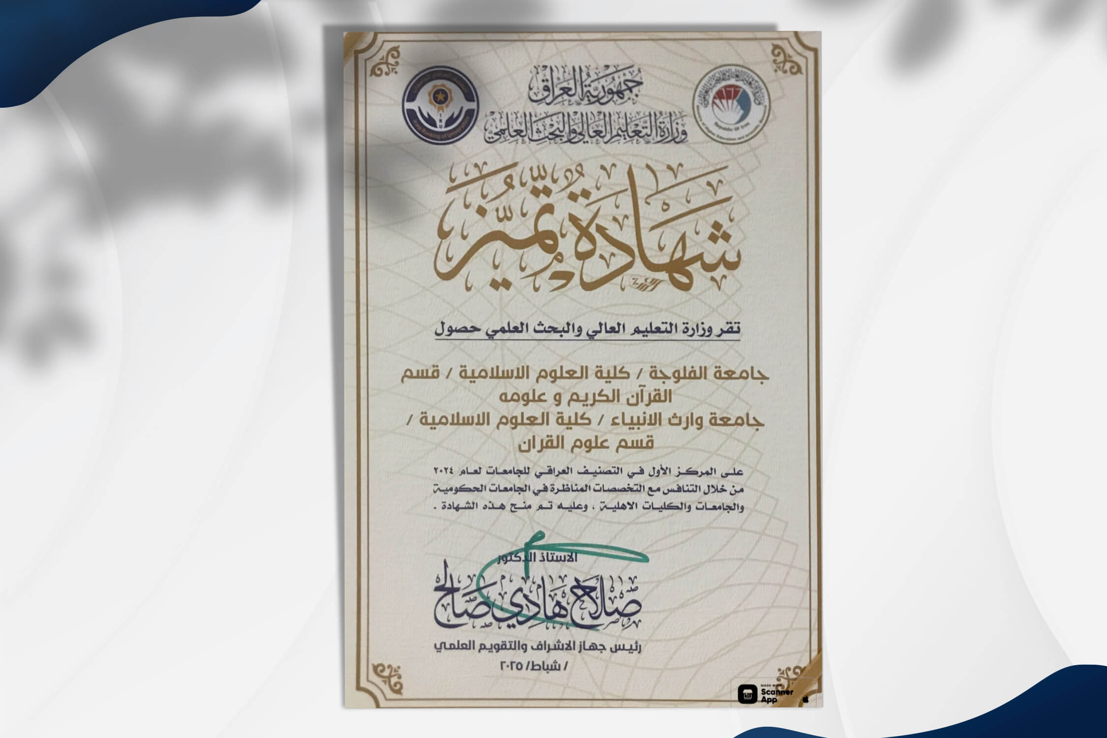 The Ministry of Higher Education and Scientific Research honoured the Dean of the College of Islamic Sciences at Warith Al-Anbiyaa University, Dr Talal Faeq Al-Kamali, following the College’s achievement of first place among Colleges of Islamic Sciences in Iraq in the Iraqi National University Ranking, which included both public and private universities.