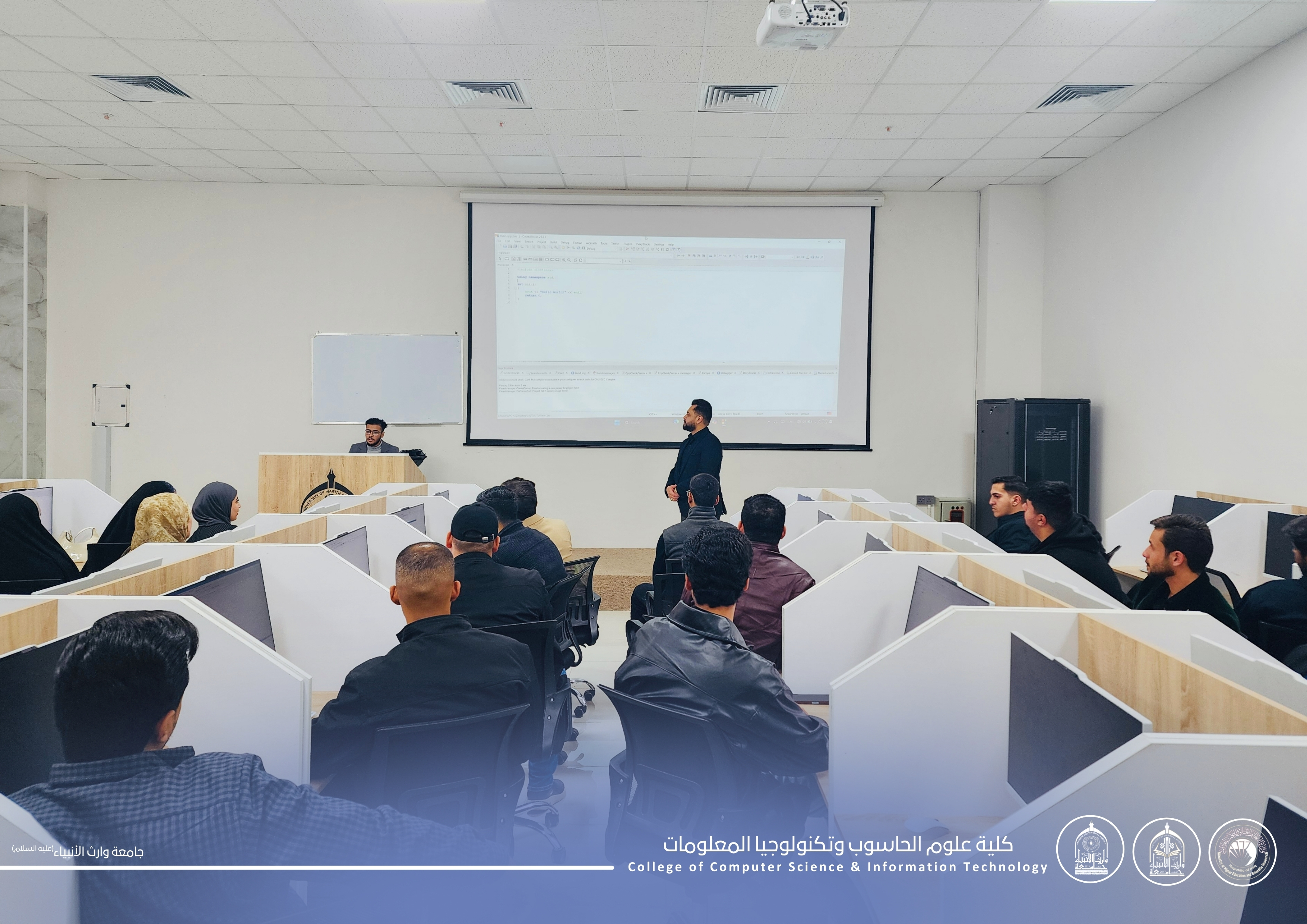 As part of the practical lectures for first-year students at the College of Computer Science and Information Technology – University of Warith Al-Anbiyaa (peace be upon him), students continue to apply the concepts of: