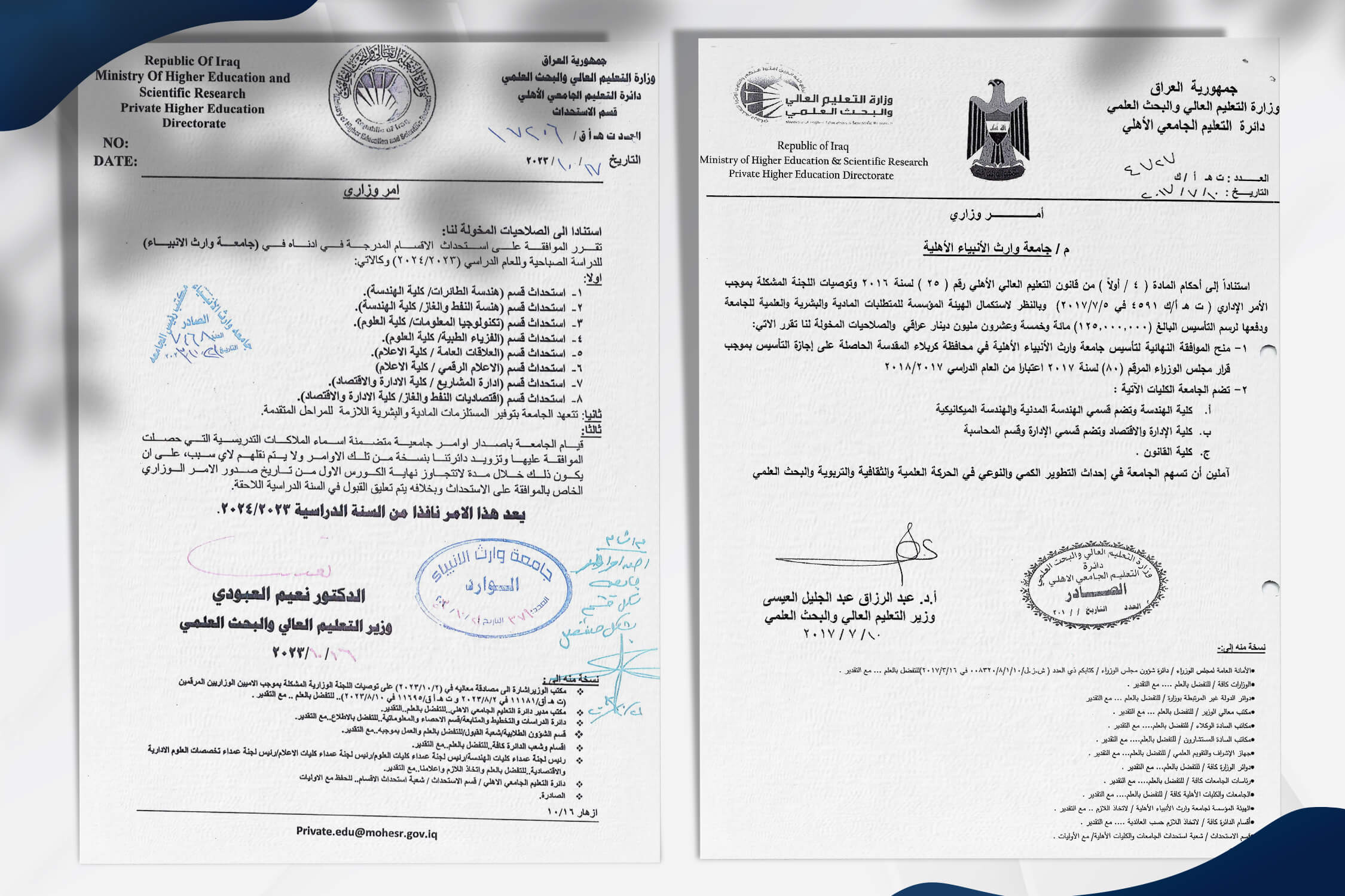 The University of Warith Al-Anbiyaa (UOWA) is a private, non-profit institution officially recognised by the Iraqi Ministry of Higher Education and Scientific Research under Ministerial Order No. (T.E/K 4727) in 2017. Established with the support of the Holy Shrine of Imam Hussein (PBUH) in the holy city of Karbala, the university was founded on the belief in the value of education and the preparation of qualified professionals to contribute to societal development and progress.