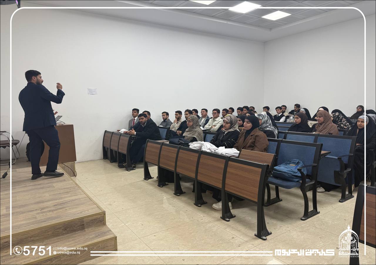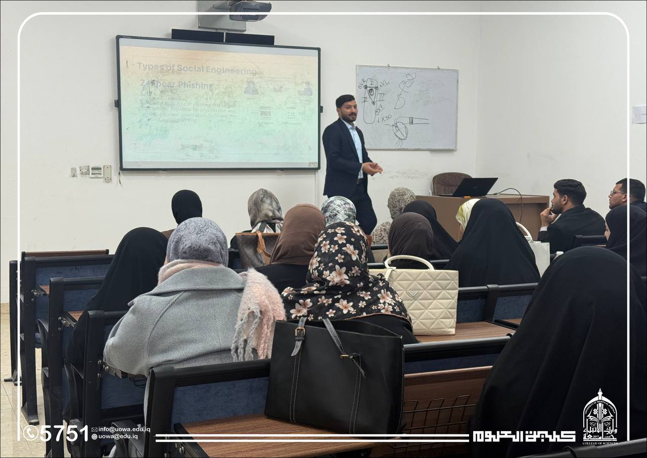 The workshop was presented by Asst. Lect. Hassan Sabah Kazim, who reviewed the most common methods and strategies used in social engineering, supported by practical and analytical examples of electronic fraud attempts. The workshop also addressed information protection techniques and ways to enhance the level of cybersecurity, including effective password management, verification of information sources, and the ability to recognize fraudulent messages and phishing attacks, in accordance with the latest academic standards and best practices in this field.