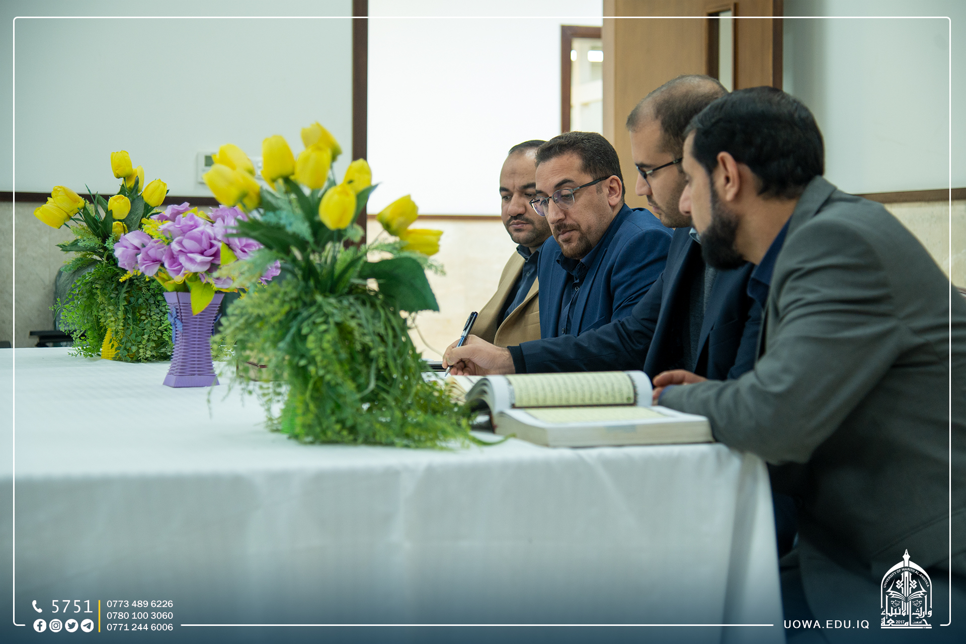 The Presidency of Warith Al-Anbiyaa University represented by Prof. Dr. Nawfal Al-Araji, Assistant President for Administrative Affairs, received a delegation from the Shiite Endowment Office (Department of Shrines in Iraq) headed by Mr. Alaa Al-Qassim, Director General of Shrines. The mechanism of cooperation between the Diwan and the University was discussed through the publication of scientific research, and the establishment of scientific and educational seminars for students.